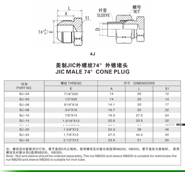 擴(kuò)口式管接頭—美制JIC外螺紋74°外錐堵頭